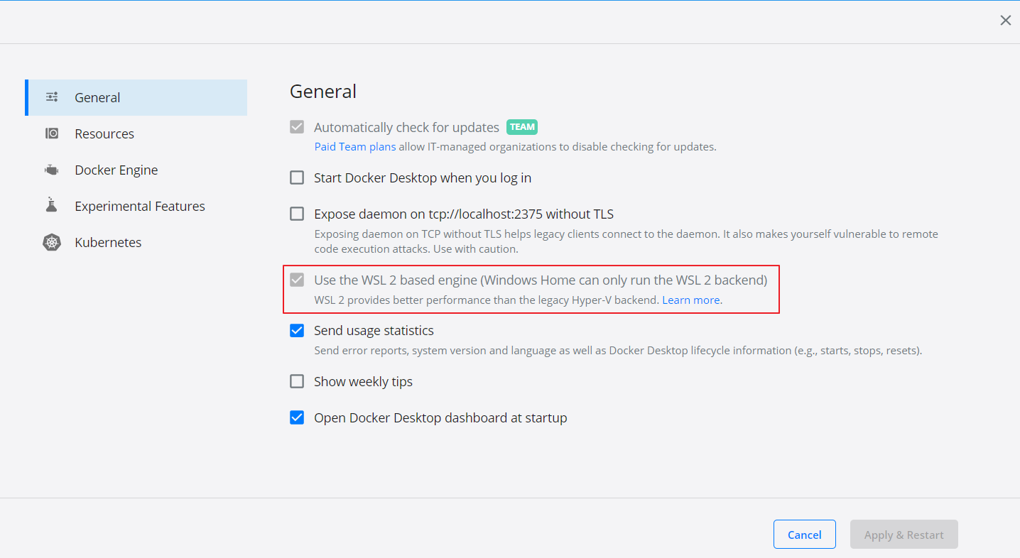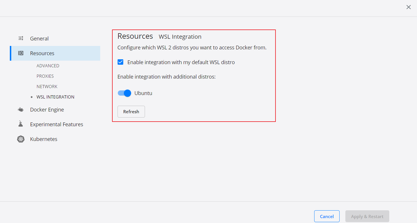 We recommend to activate the WSL integration in Docker Desktop settings.
