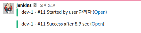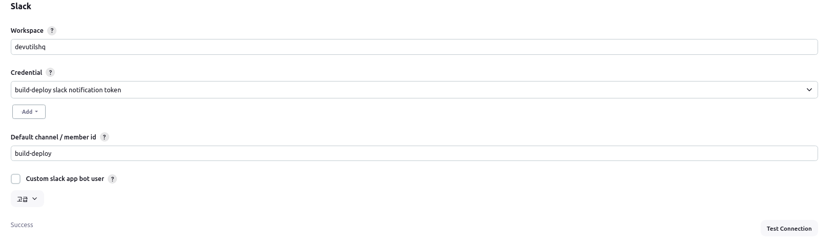 - workspace : slack 에서 jenkins CI 설치시 알려준 "팀 하위 도메인" 입력