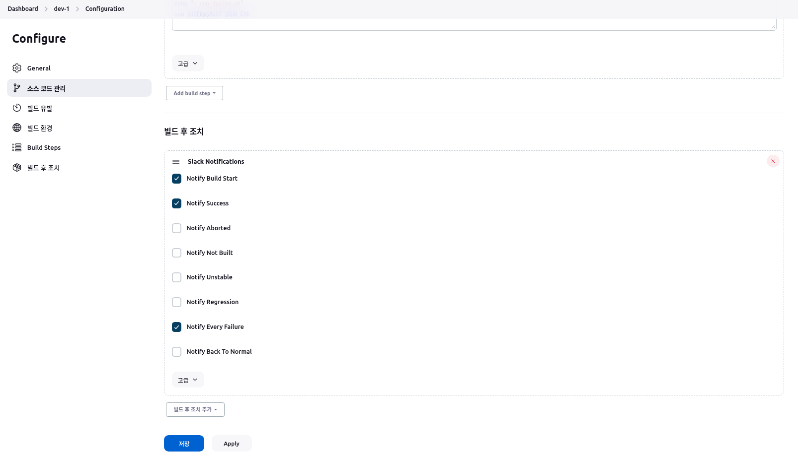 임의 Item 설정에 "빌드 후 조치" 항목 부분에 아래와 같이 체크 후 저장