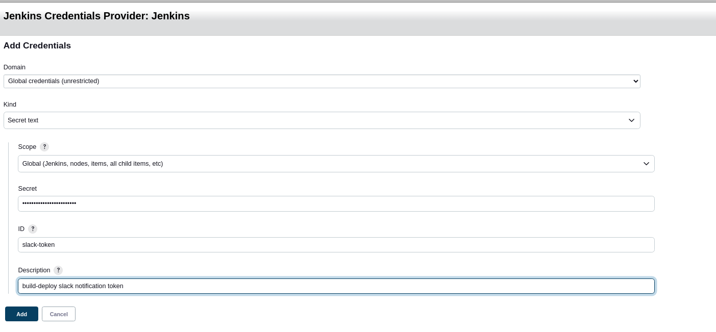 Credentail 추가시 kind는 Secret text 선택하고 Secret 영역에 통합 토큰 자격 증명 ID 입력