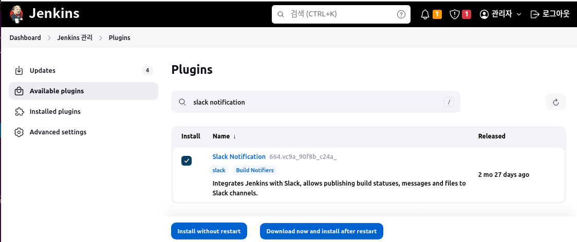 - [Jenkins관리 > Plugins] 에서 slack notification 설치