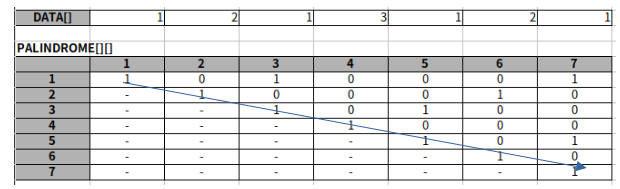 PALIDROME[i][j] = (A[i] == A[j] && PALIDROME[i + 1][j - 1]) ? 1 : 0;