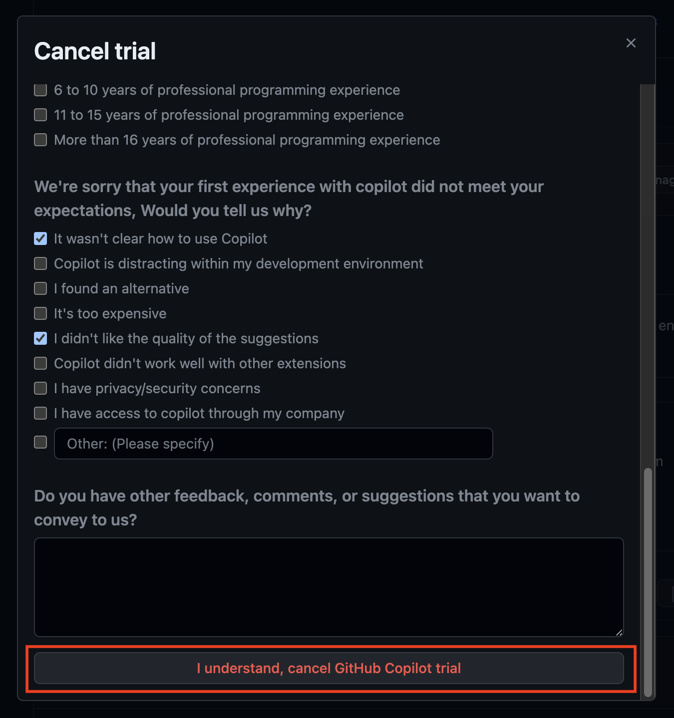 3. 간단한 설문 조사 참여 후 하단에 I understand, cancel GitHub Copilot trial 버튼 누르면 구독 해지 완료