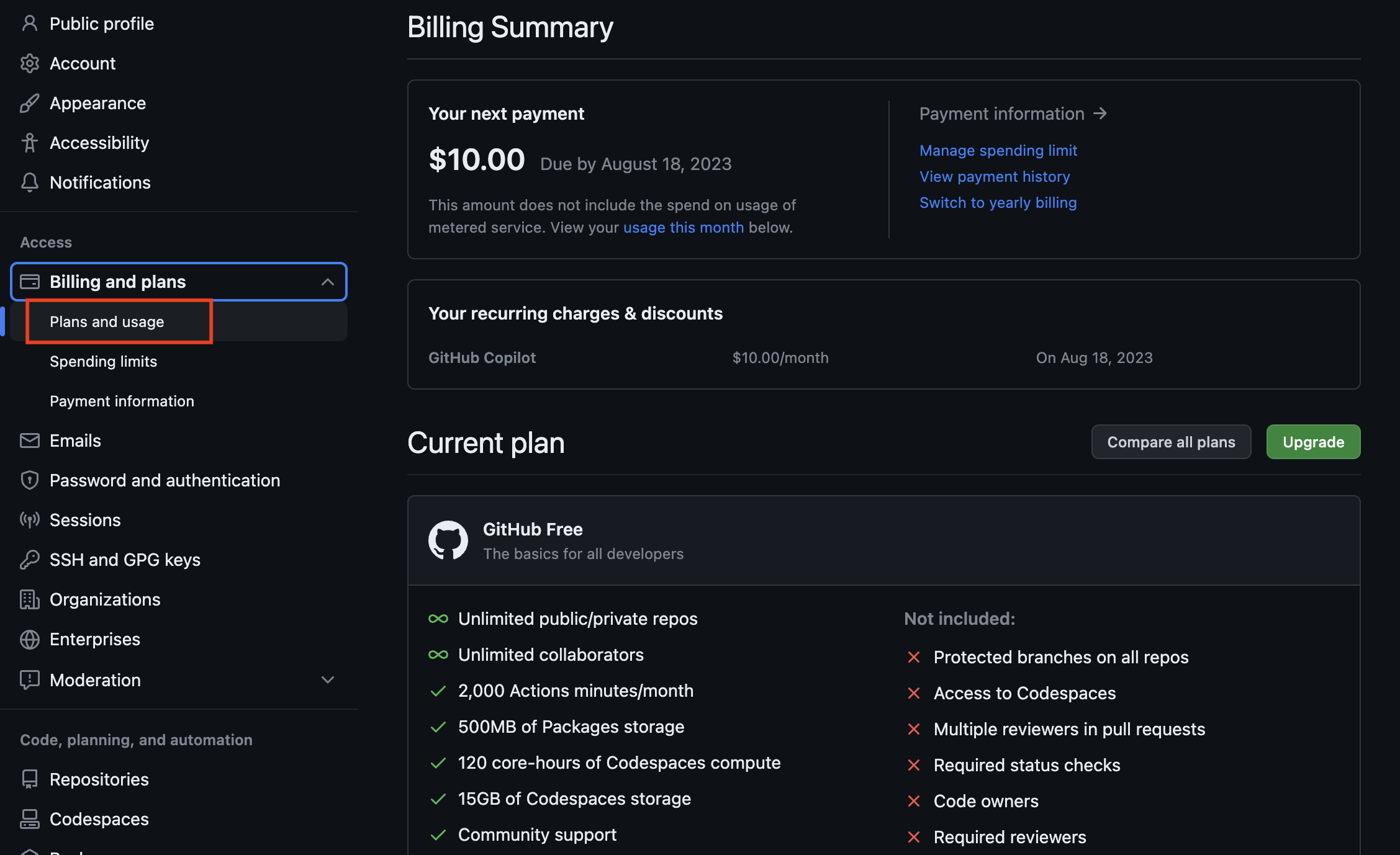 1. 좌측 [Access > Billing and plans > Plans and usage] 메뉴 선택
