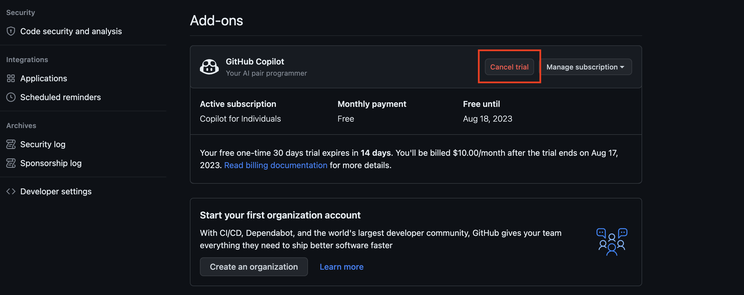 2. 스크롤을 아래로 내려 [Add-ons] GitHub Copilot 에서 Cancel trial 버튼 누름