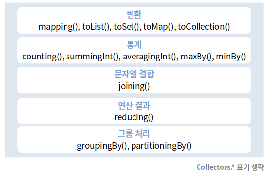 - Collectors.mapping(), Collectors.reducing(), Collectors.counting() 등과 함께 그룹별 결과 처리 가능