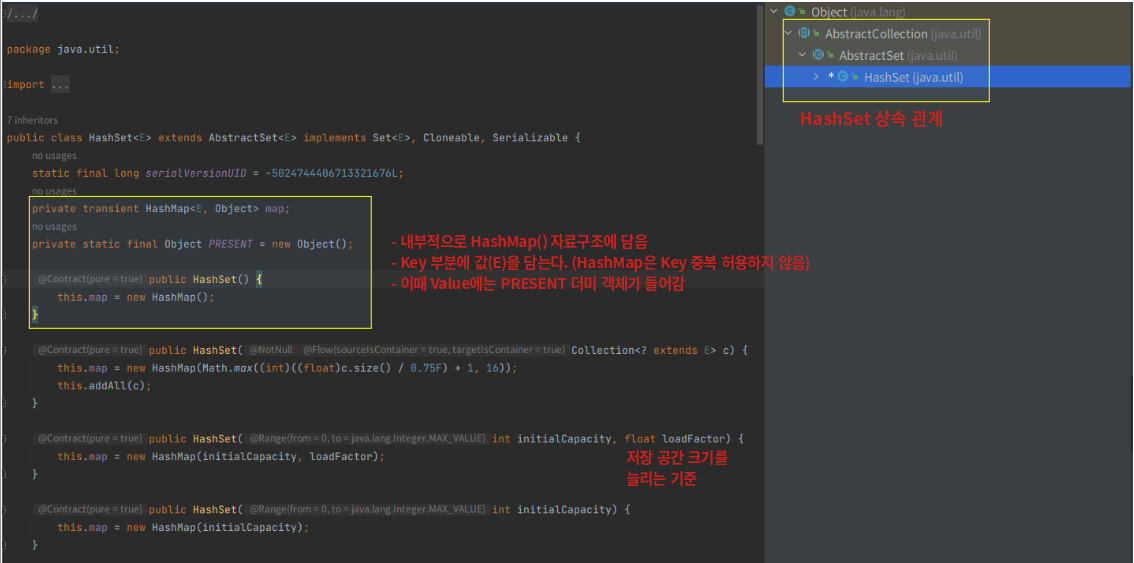 HashSet의 경우 내부적으로 HashMap 을 사용하고, Key에 element를 담는다