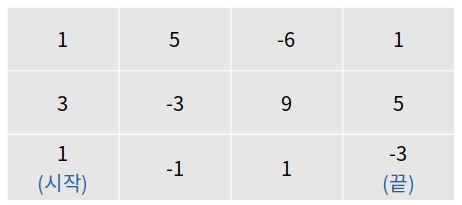 - 시작 지점의 행과 열의 경우 자기 자신과 이전 행 또는 열 값을 더하여 초기화 수행