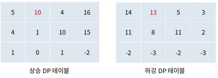 - 상승과 하강일때 dp 테이블을 각각 구한 후 반복문 돌며 합했을 때 최대치를 구하면 됨
