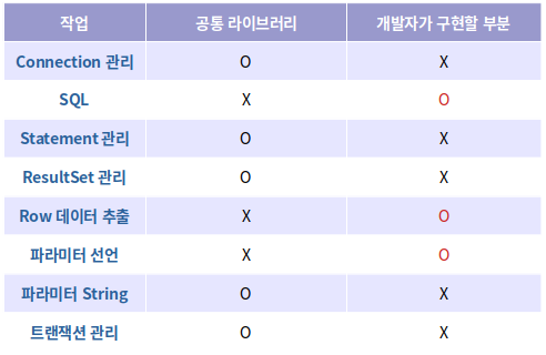(예로 query 생성, PrepareStatement 파라미터 설정, ResultSet의 Row 데이터 추출 부분을 개발자가 직접 구현해야 한다)