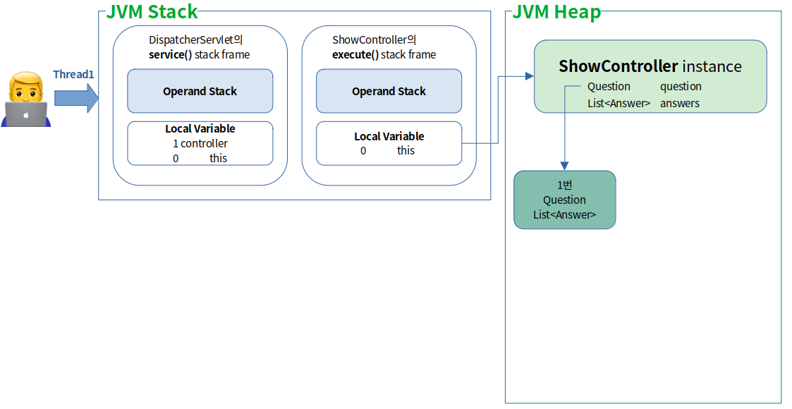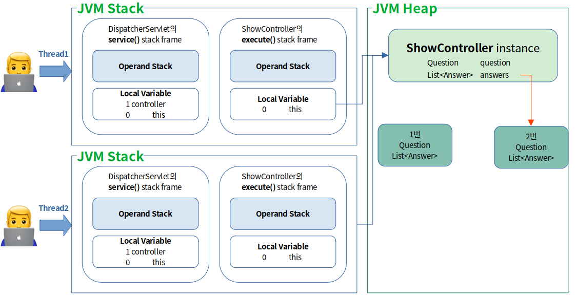 ⑦ next.web.qna 패키지의 ShowController는 멀티스레드 상황에서 문제가 발생할 가능성이 있는 코드이다. 멀티스레드 상황에서 문제가 발생하지 않도록 수정한다. 그리고 멀티스레드에서 문제가 되는 이유를 작성하라 ( 2023-10-27 완료 , 아래 참고)