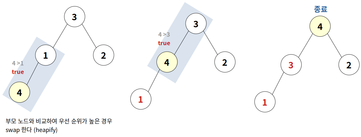 - 조건을 만족할 때까지 우선 순위 비교하여 swap을 수행한다