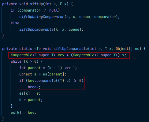 private static <T> void siftUpComparable(int k, T x, Object[] es) {