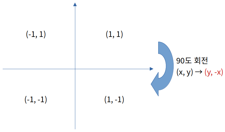 - 절차1. (x, y) -> (y, -x) 로 이동