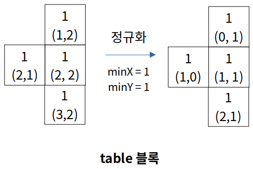 이때 빈 영역과 블록 영역을 맞추는 것을 고려해서 정규화(normalize) 시킨 결과를 저장한다