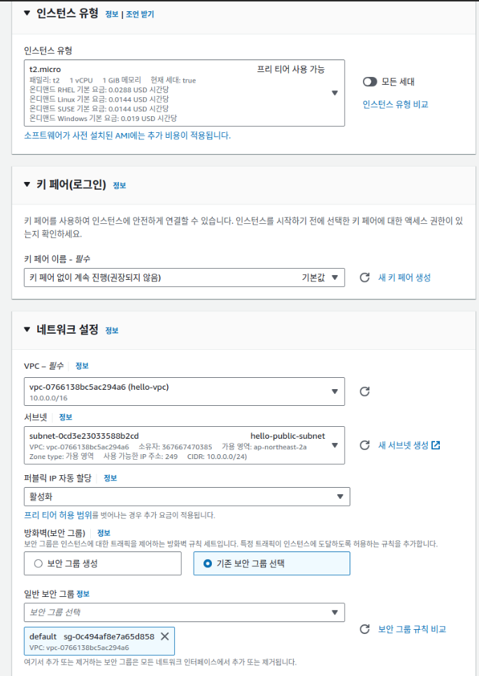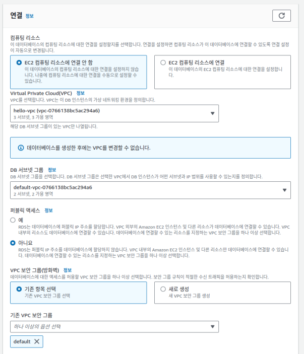 생성해둔 hello-vpc에 연결, 퍼블릭 액세스는 "아니오", 그리고 보안 그룹은 default로 설정한 후 생성한다.