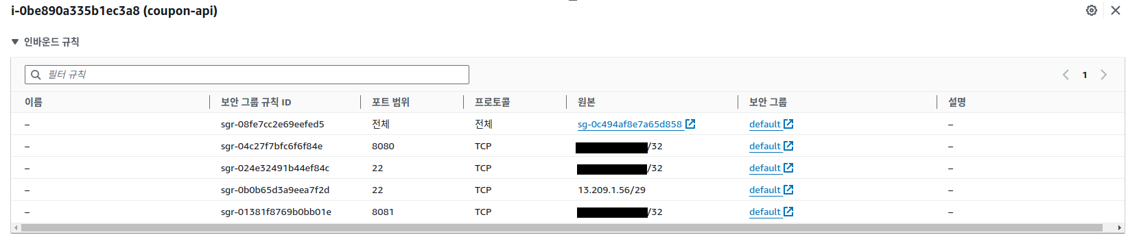 부하 테스트이기 때문에 간단하게 default 보안 그룹에 아래와 같이 인바운드 규칙을 설정했다. ( 처리한 부분은 집 ip)