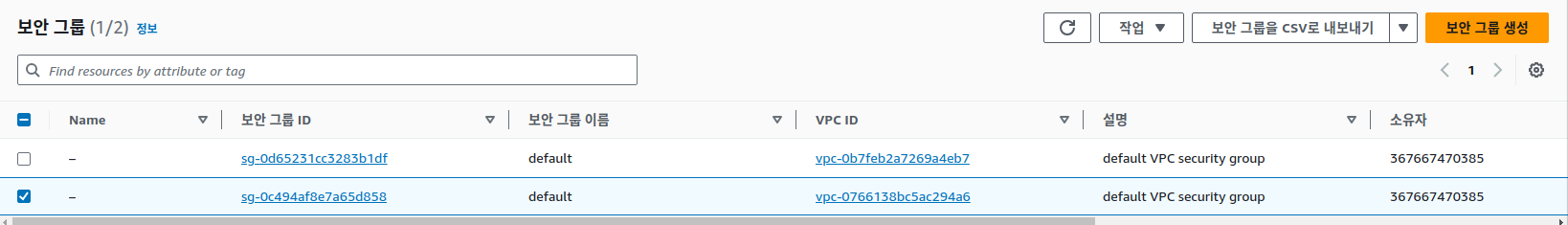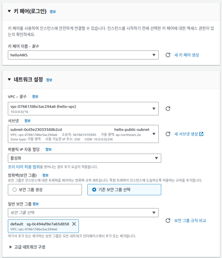 - 보안 그룹 : 기본 defualt (*따로 관리할 필요 있으면 보안 그룹 개별 관리)