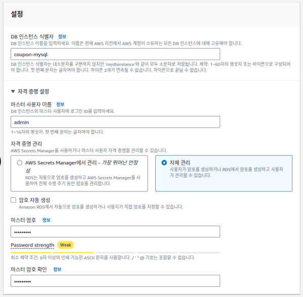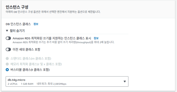 인스턴스 사양은 db.t4g.micro(2vCPU, 1GiB RAM) 선택
