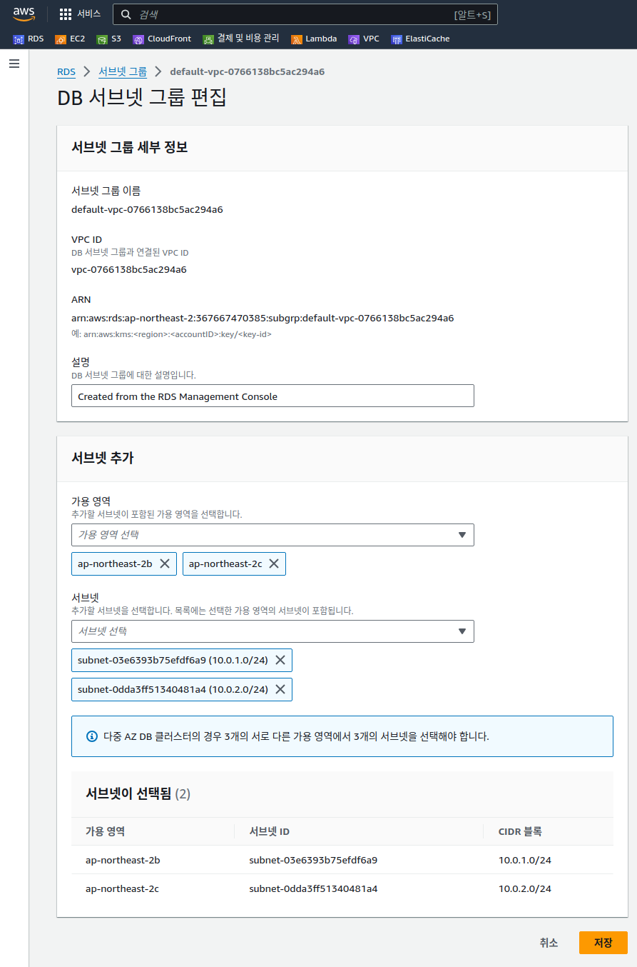 마찬가지로 RDS 서브넷 그룹을 먼저 생성한다. 이번에는 *private-subnet(10.0.1.0/24)와 *db-subnet(10.0.2.0/24) 두 개를 설정해보았다. (테스트 용도이기 때문에 *private-subnet 하나만 설정해도 상관없지 않았나 싶다)