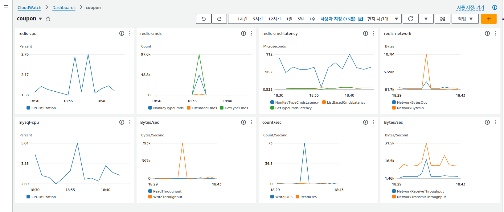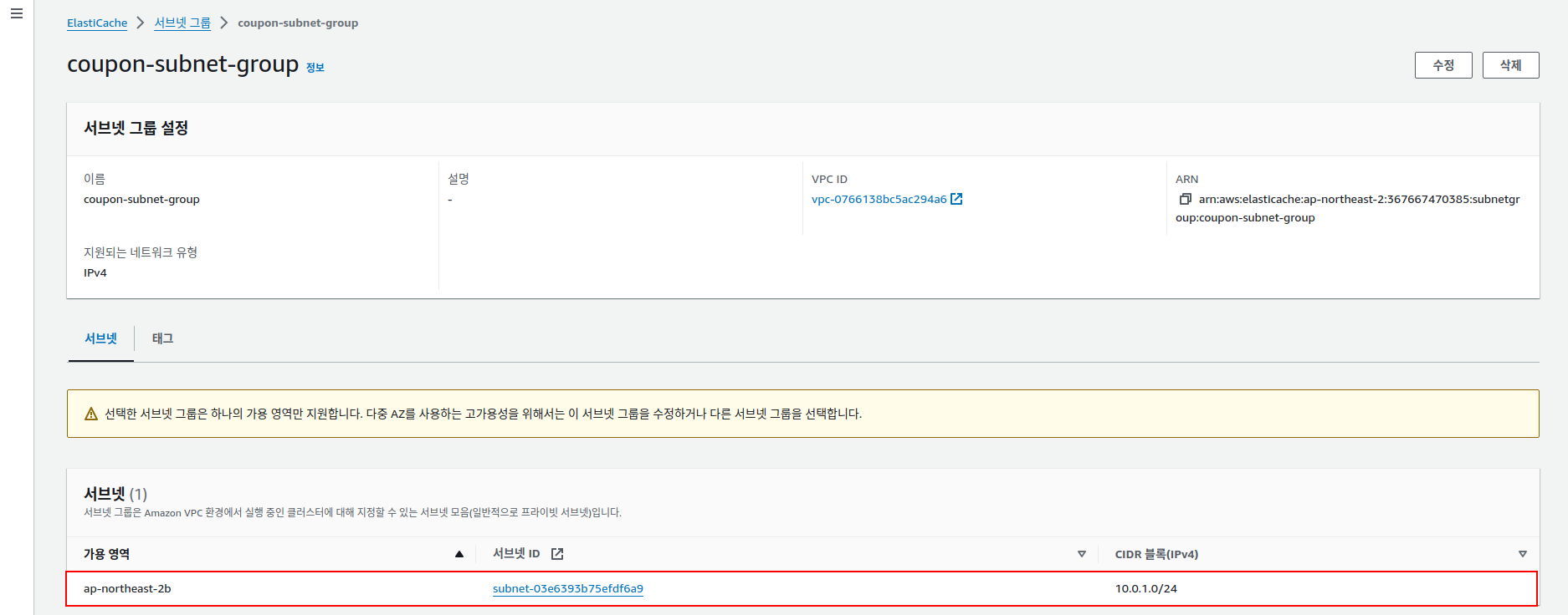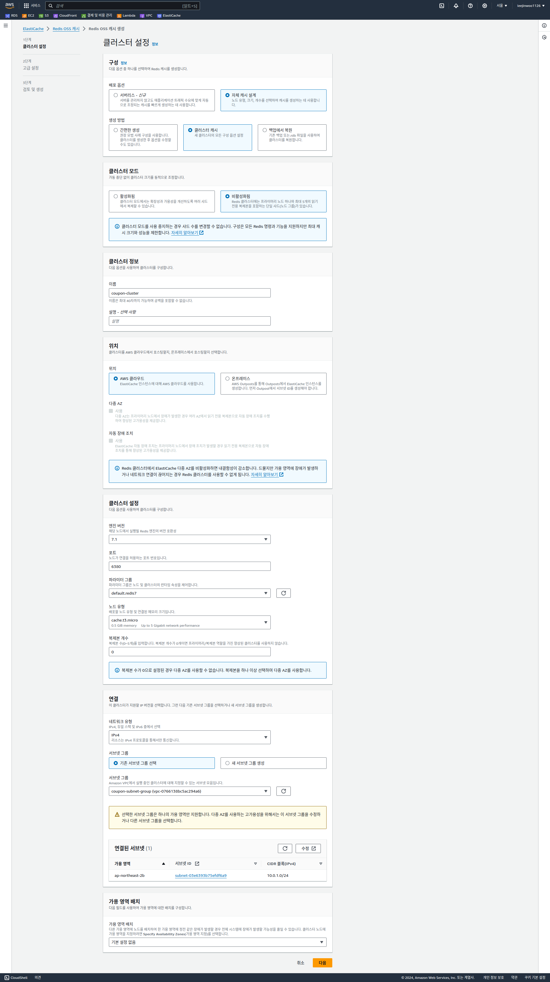이제 ElasticCache 인스턴스(Redis)를 생성한다. 인스턴스 사양은 cache.t3.micro, 서브넷 그룹은 앞서 생성한 coupon-subnet-group을 설정한다. 생성 버튼을 누르고 5분 정도 기다리면 활성화된다.