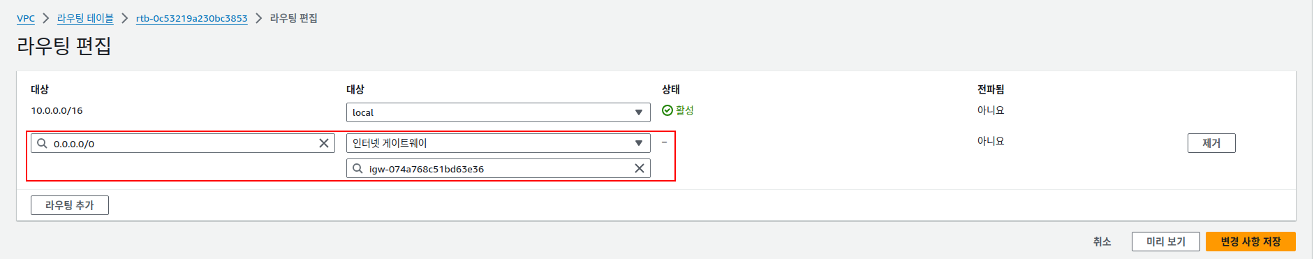 외부 접속을 허용할 *public-subent 라우팅 테이블에 I.G를 연결한다.