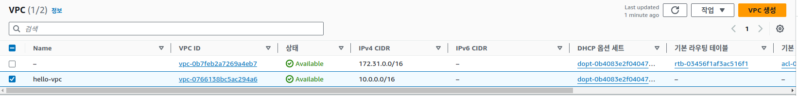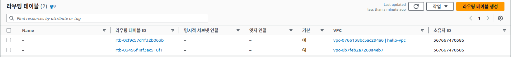 라우팅 테이블도 기본 생성되는데 vpc내 서브넷 생성하는 경우 자동 연결된다.