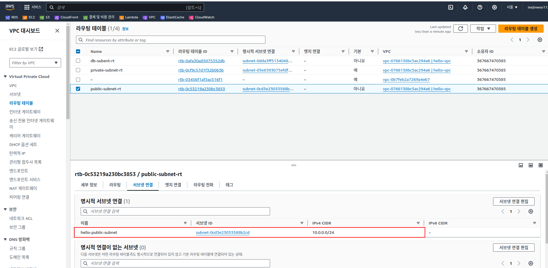 라우팅 테이블 할당하기 전에는 "명시적 연결이 없는 서브넷(3)"으로 표시되어 있었는데, 각 라우팅 테이블 생성하고 서브넷 연결하면 아래와 같이 "명시적 연결이 없는 서브넷(0)"으로 표기된다.