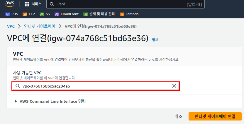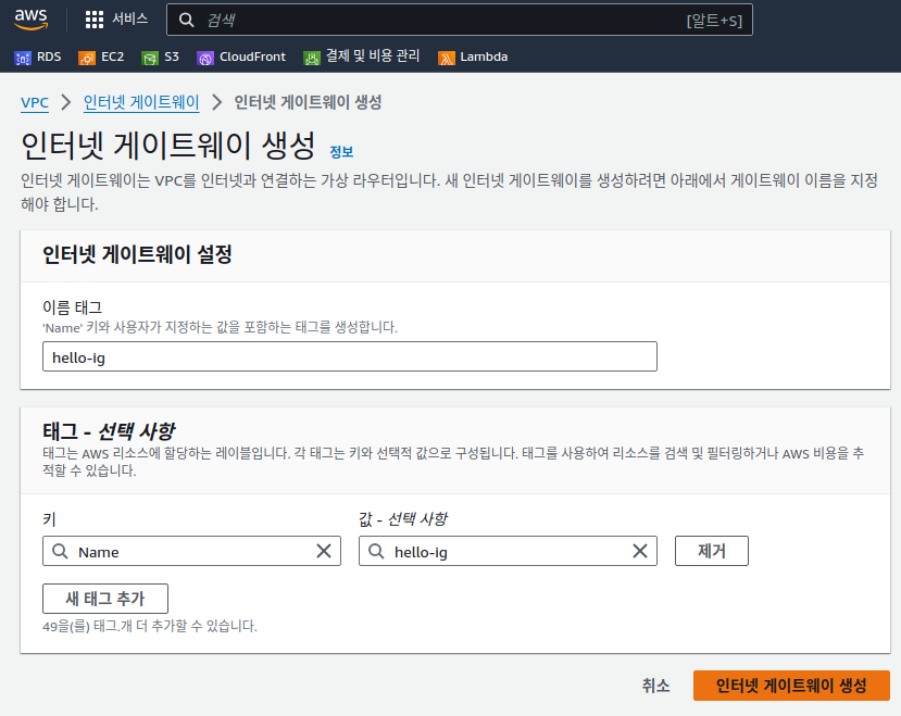 - 인터넷 게이트웨이는 VPC당 하나씩만 생성할 수 있습니다