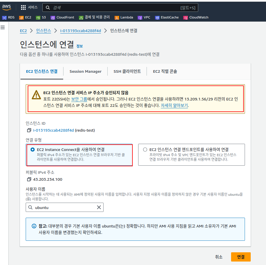 EC2 인스턴스 목록에서 bastion host 선택하고 우측 상단 [연결]버튼을 누른다. 그리고 웹 콘솔로 연결시 보안그룹 설정이 추가로 필요하다고 친절하게 알려준다. (ex. 13.209.1.56/29, 22/tcp 추가)