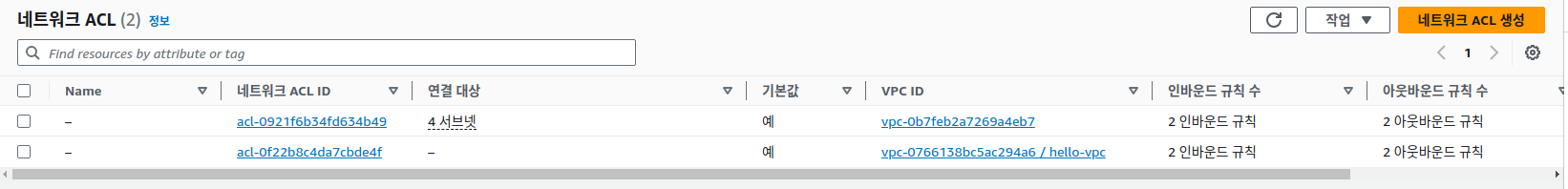 커스텀 VPC 생성시 라우팅 테이블, 기본 NACL(네트워크 ACL), 기본 보안 그룹(default) 만들어진다. 알기로는 네트워크 ACL은 stateless라서 인바운드, 아웃바운드를 둘 다 설정해야 하는 것으로 알고 있다.