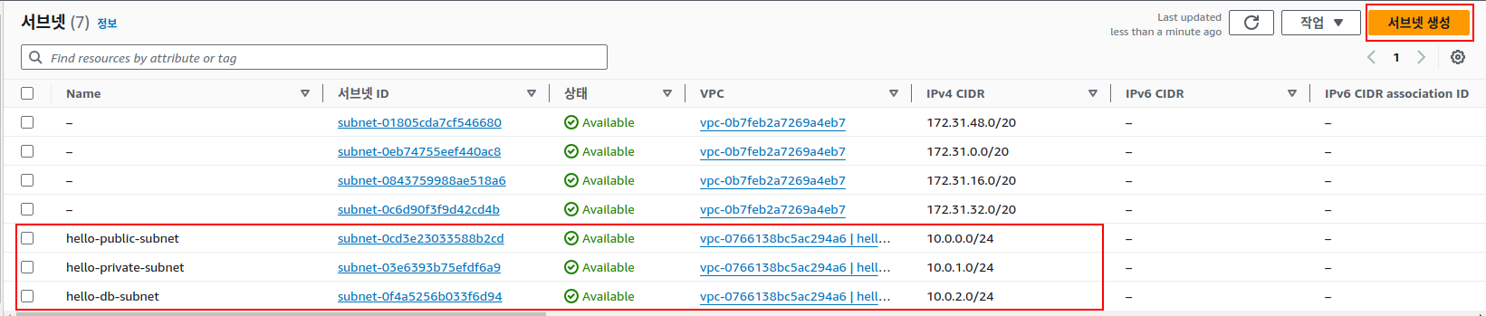 hello-vpc에 소속된 서브넷 총 3개를 신규 생성한다.