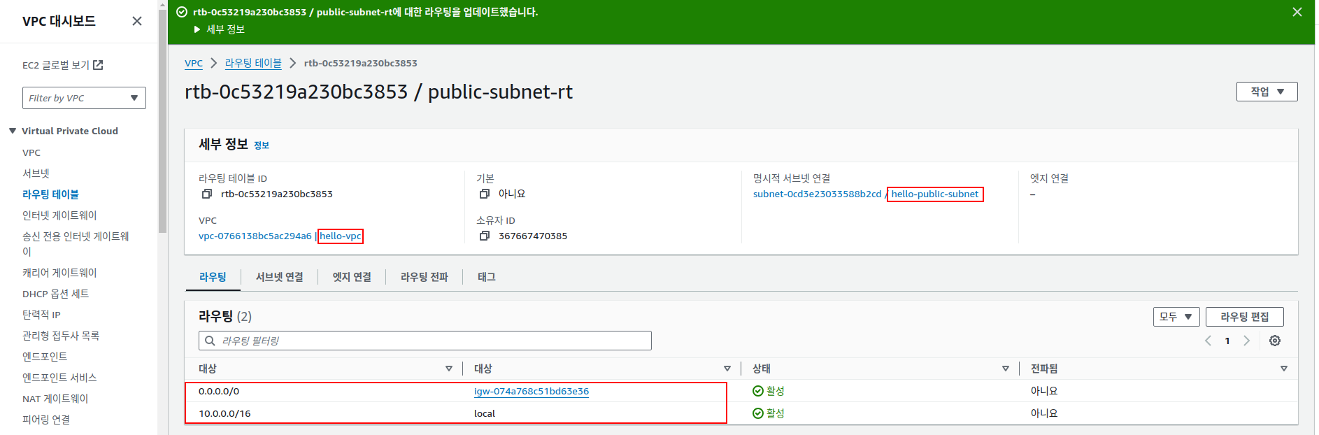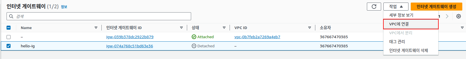 생성한 hello-ig와 hello-vpc를 연결해준다