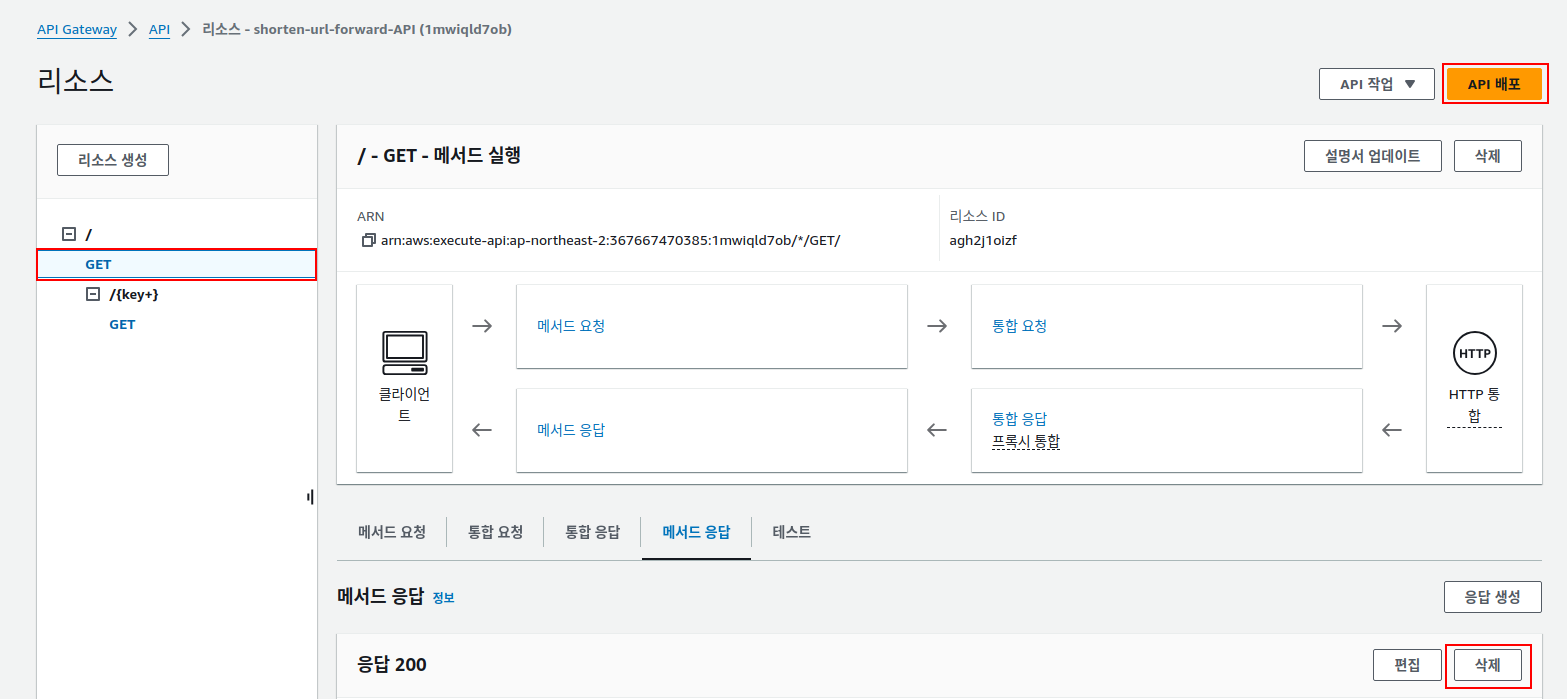 메서드 생성이 되면 메서드 응답에 200을 삭제 후 "API 배포" 버튼을 누른다