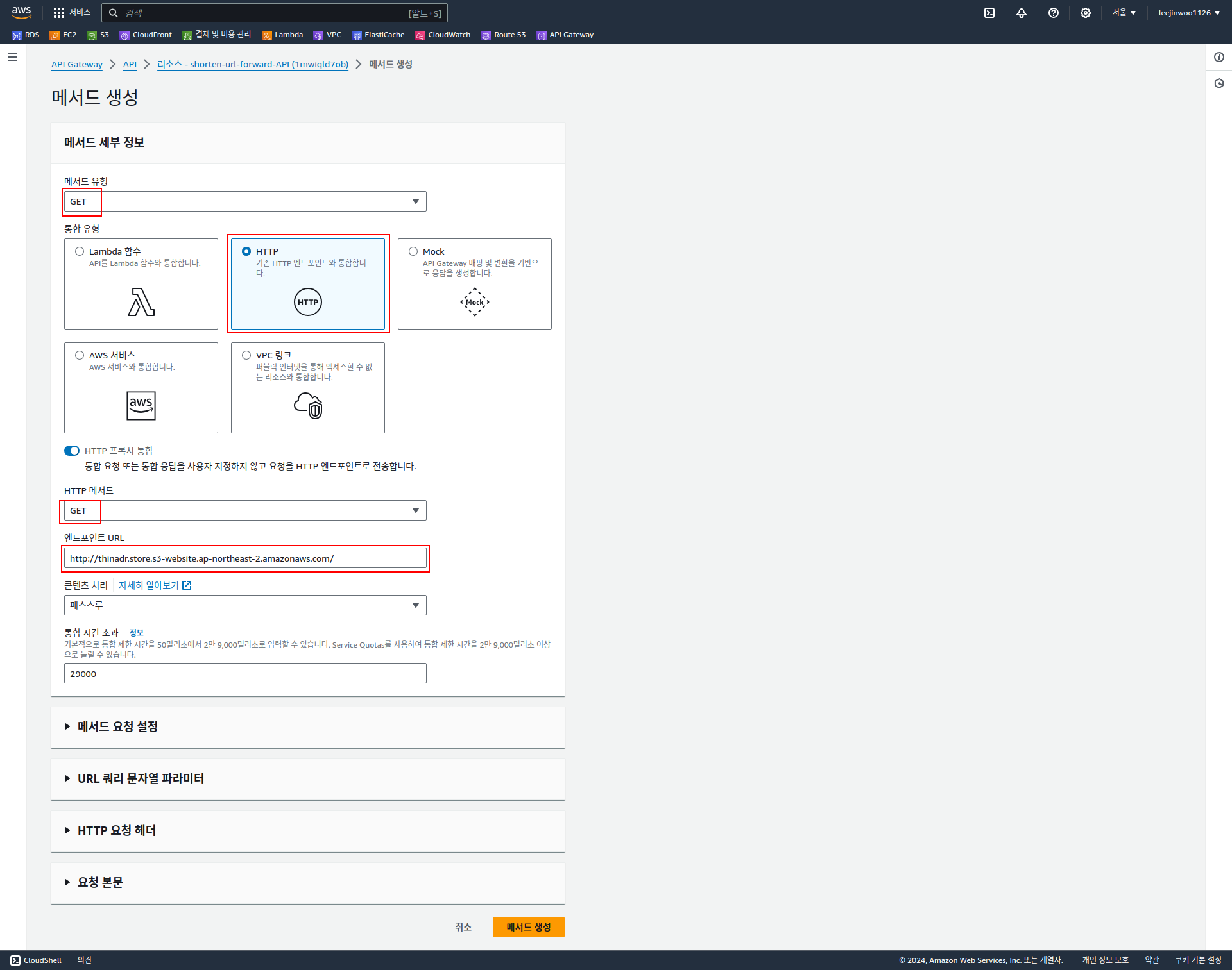 shorten-url-forward와 연결한 API Gateway에 GET 메서드를 추가한다. 엔드포인트 URL에는 S3 정적 웹 호스팅 엔드포인트 주소를 입력한다