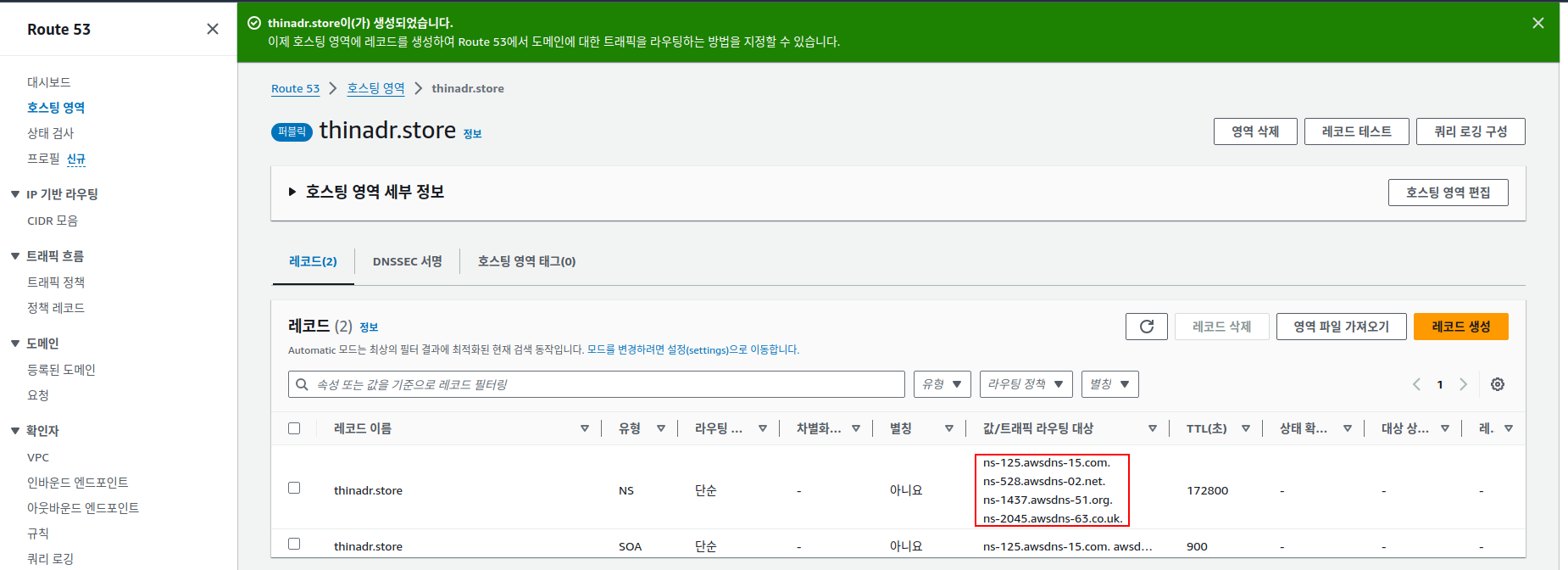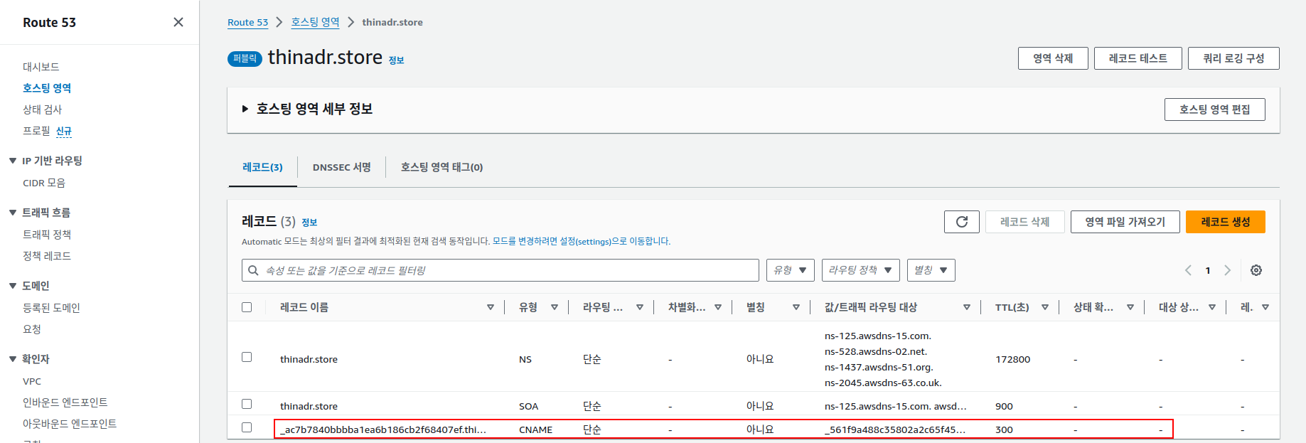"호스팅 영역 생성"을 선택하고 명칭은 구매한 도메인(ex. thinadr.store)으로 설정한다