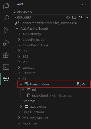 앞서 AWS Toolkit Extension 설치해뒀기 때문에 우클릭해서 s3 루트 경로에 index.html 파일 업로드한다