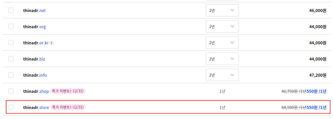 카페 24에서 원하는 도메인을 구매했다. 카페 24를 선택한 이유는 우선 대중적이기도하고, 테스트 용도이므로 비용이 저렴했으면 좋겠다고 생각했기 때문이다. 마침 특가 이벤트를 하고 있어 550원에 1년간 도메인 이용가능했기 때문에 바로 결제 했다