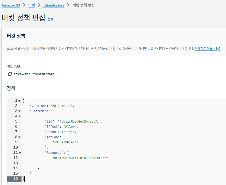 버킷 정책도 가이드 라인에 맞춰 설정을 해주었다