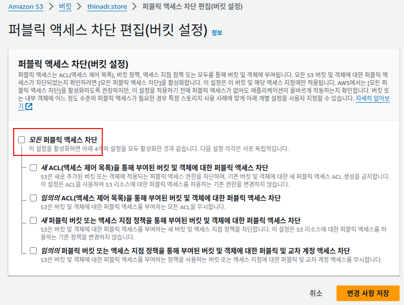 우선 S3의 모든 퍼블릭 엑세스 차단 체크 박스를 해제해야 하고, 버킷 정책 설정해줘야 한다. 처음 s3 생성시 퍼블릭 엑세스를 모두 차단하는게 안전하다고 생각했는데 공식 가이드에서 풀어라 하니 따라 주었다