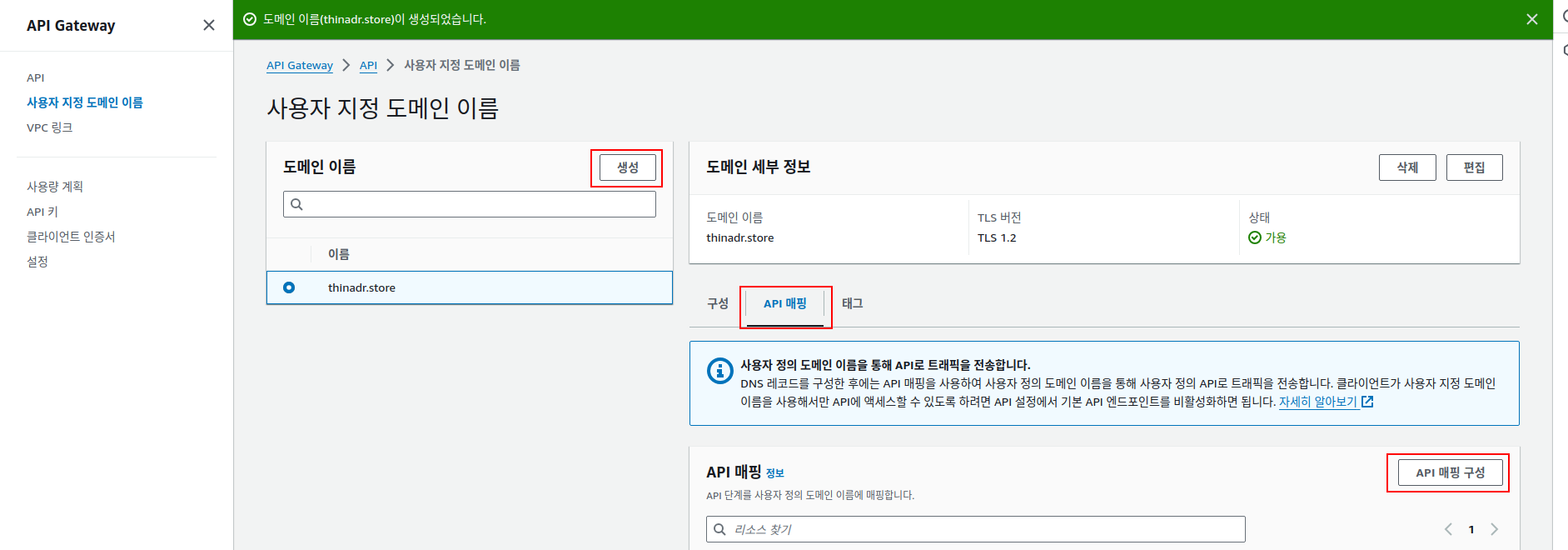 API Gateway 에서 사용자 지정 도메인 이름을 생성한다. 용도는 Route53과 API Gateway를 연결하는 중간 다리 역할로 API Mapping 정보를 설정하게 된다. 이름은 도메인 주소(ex. thinadr.store)로 설정하였다