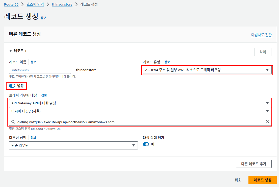 생성한 사용자 지정 도메인 이름(Custom Domain Names)을 Route53에 연결한다. 메뉴 이동 후"레코드 생성"버튼을 누른다