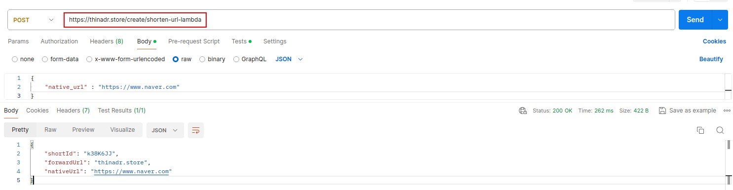참고로 축약 주소 생성 요청 주소(/create/shorten-url-lambda)가 저런건 API Gateway에서 아래와 같이 만들었기 때문이다