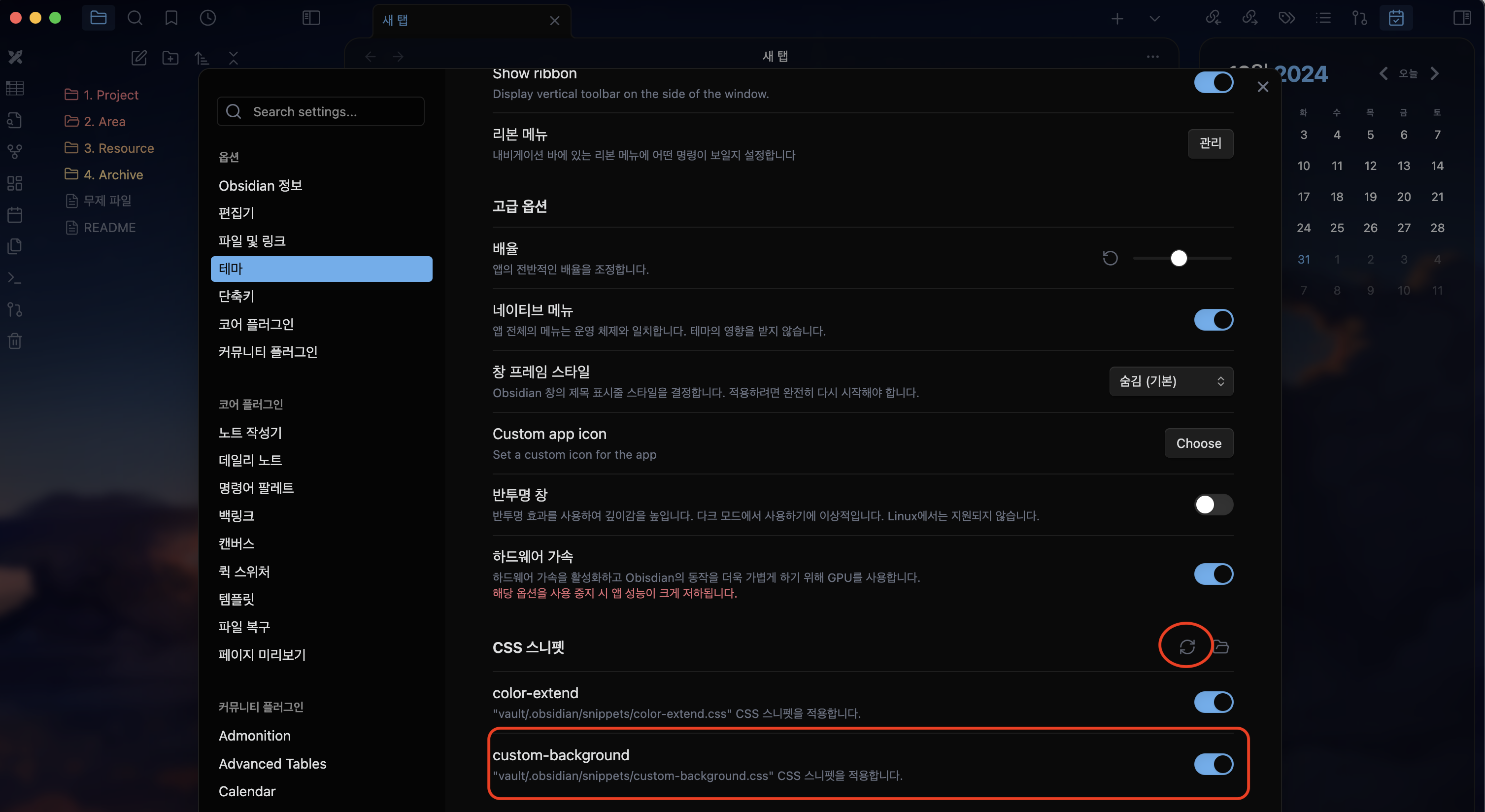 옵시디언 테마 설정에 맨 하단에 CSS 스니펫을 새로고침하면 custom-background가 추가된 것을 확인할 수 있다. 활성화 하도록 하자