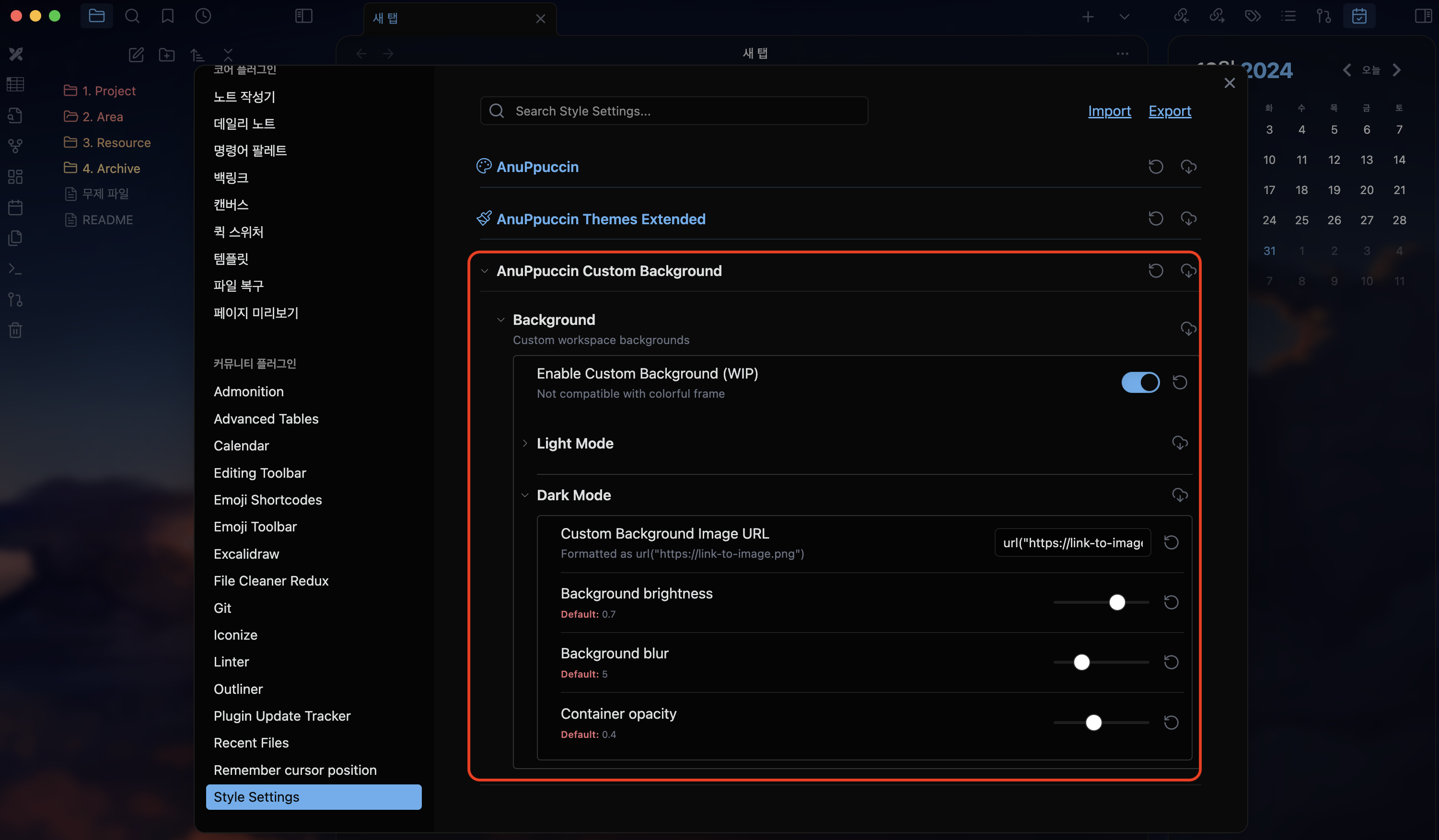그리고 Style Settings 플러그인으로 이동하면 아래와 같이 Background 설정이 활성화되고 배경 이미지를 커스텀 할 수 있다