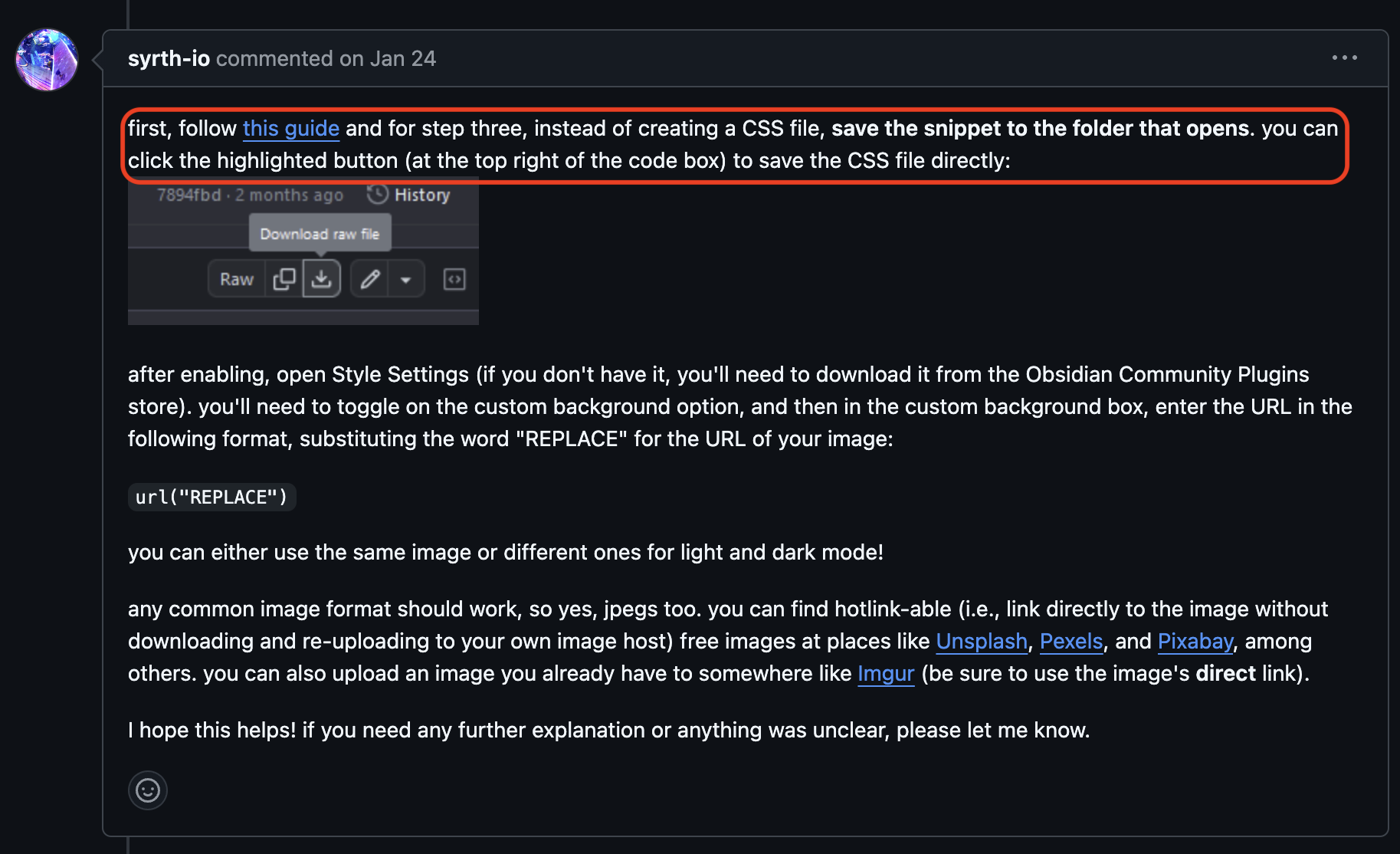 요약하자면 {valut}/.obsidian/snippets 디렉토리에 custom-background.css를 다운받아 넣고 리로드를 해야 한다