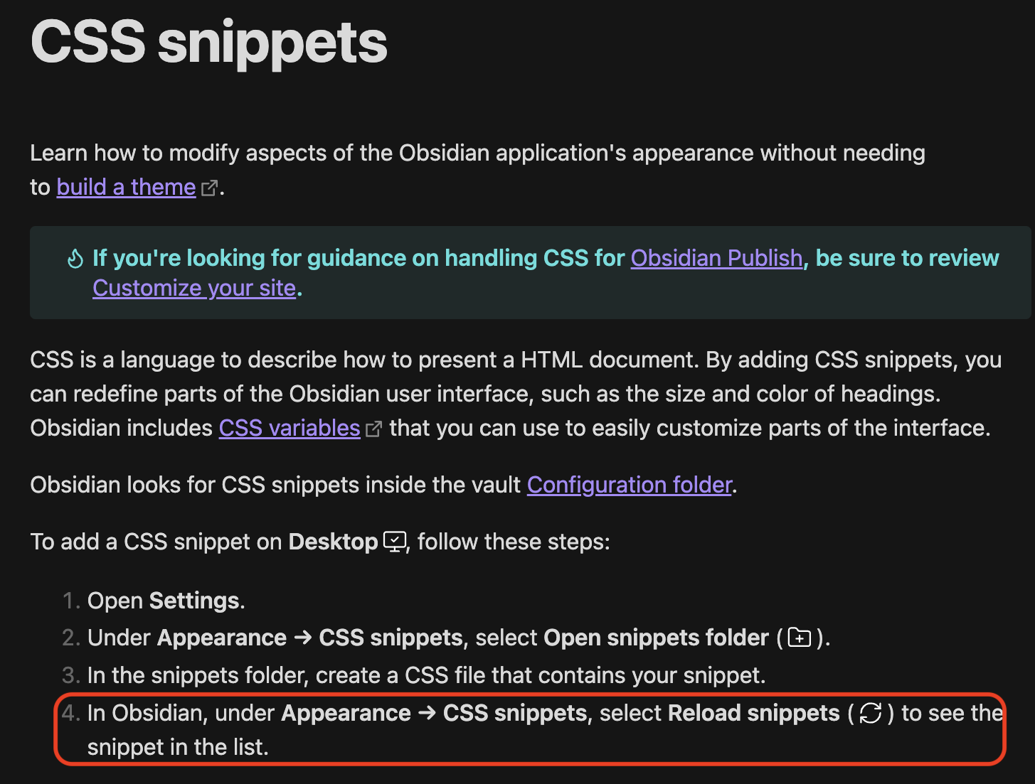 - .obsidian 폴더 안에 snippets 폴더를 생성하고 css 파일을 추가하면 된다
