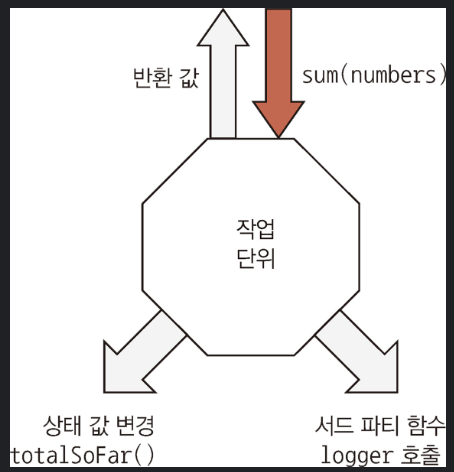 - 상태 변경 (total += result) → total이라는 전역 상태 변경