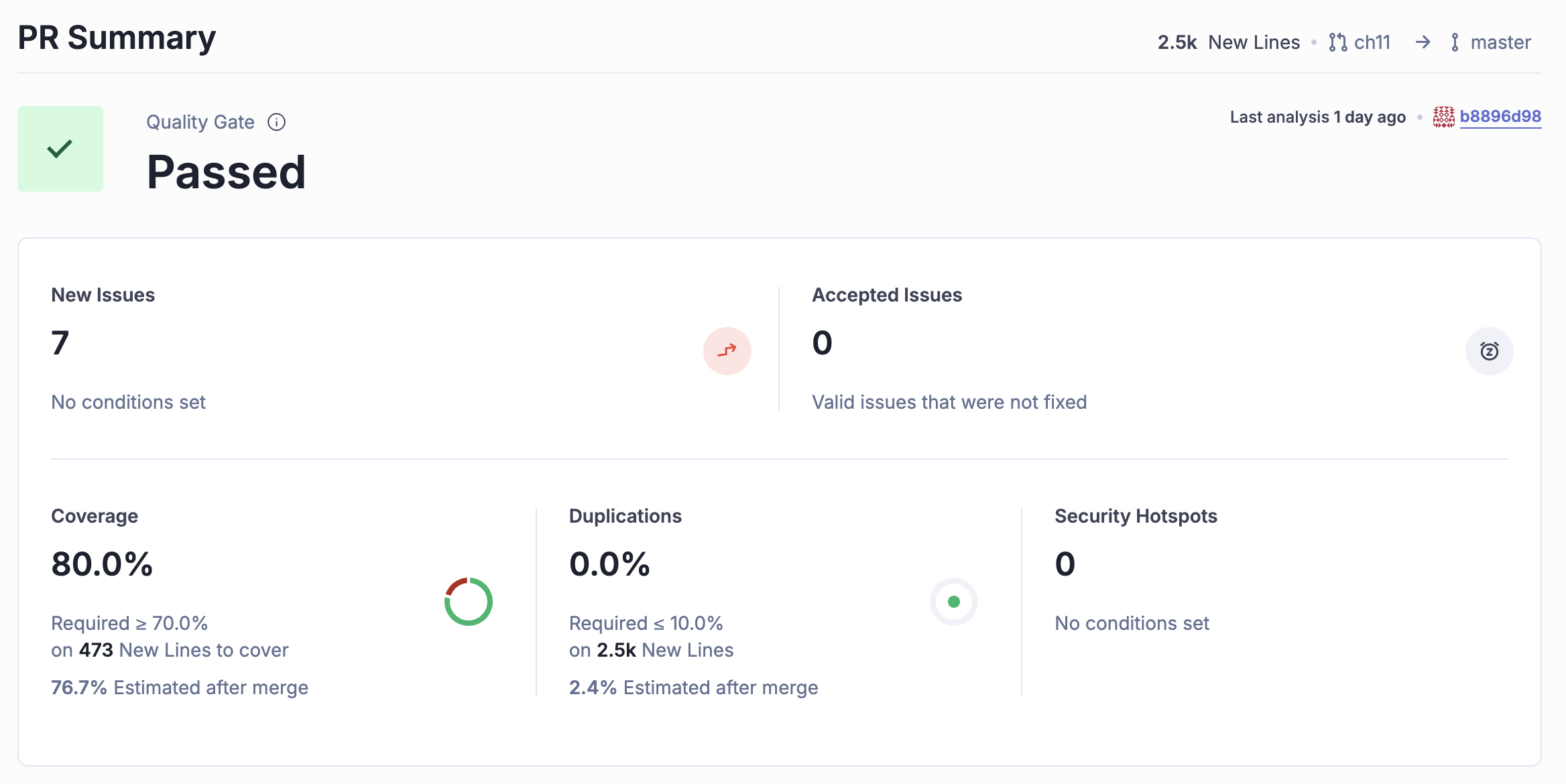 SonarCloud 프로젝트 생성시 이전 버전과 비교하도록 설정해서, 현재 브랜치의 변경 사항에 대한 커버리지만 표기 되는 것으로 보인다. master 브랜치 전체 커버리지 측정을 하려면 다시 프로젝트를 신규 생성해야 하나 싶다. (나중에 찾아보기)