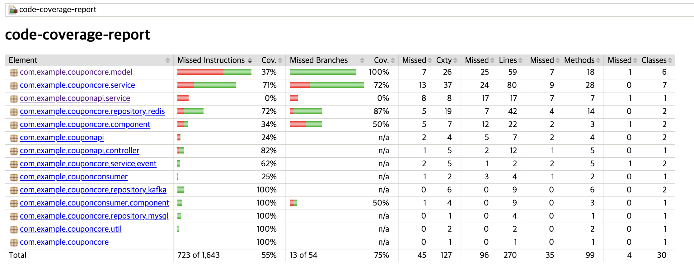 /dto/, /exception/, /configuration/과 같은 패키지까지 포함되어 전체 커버리지가 낮게 측정되었다.